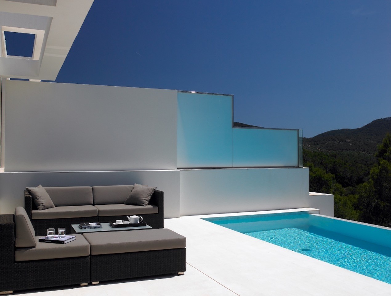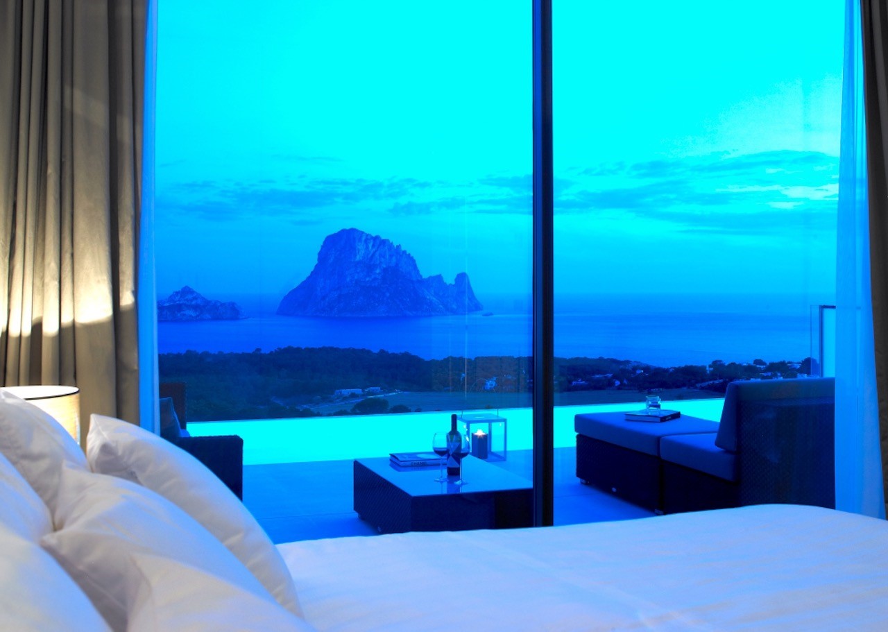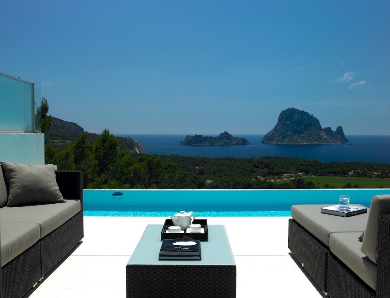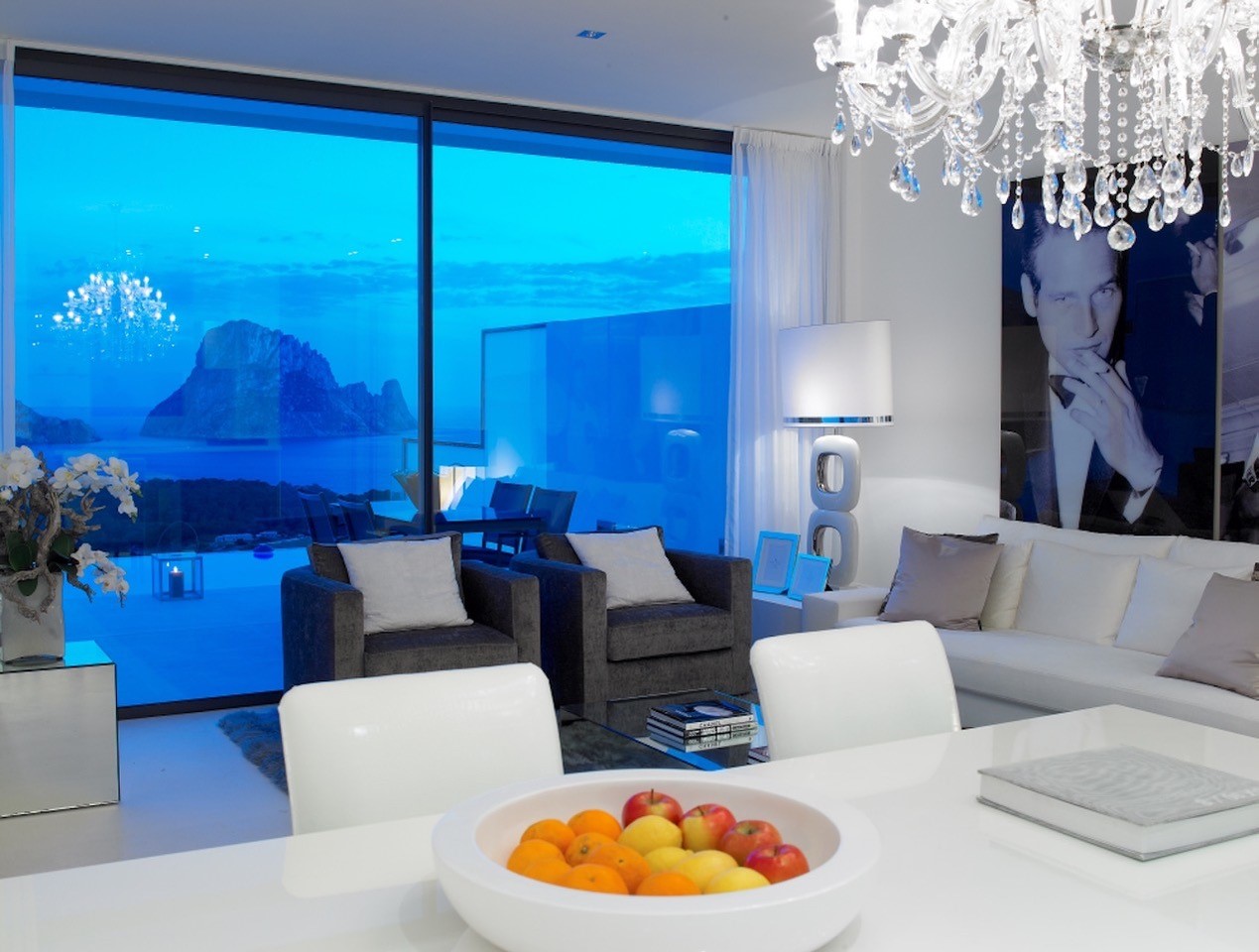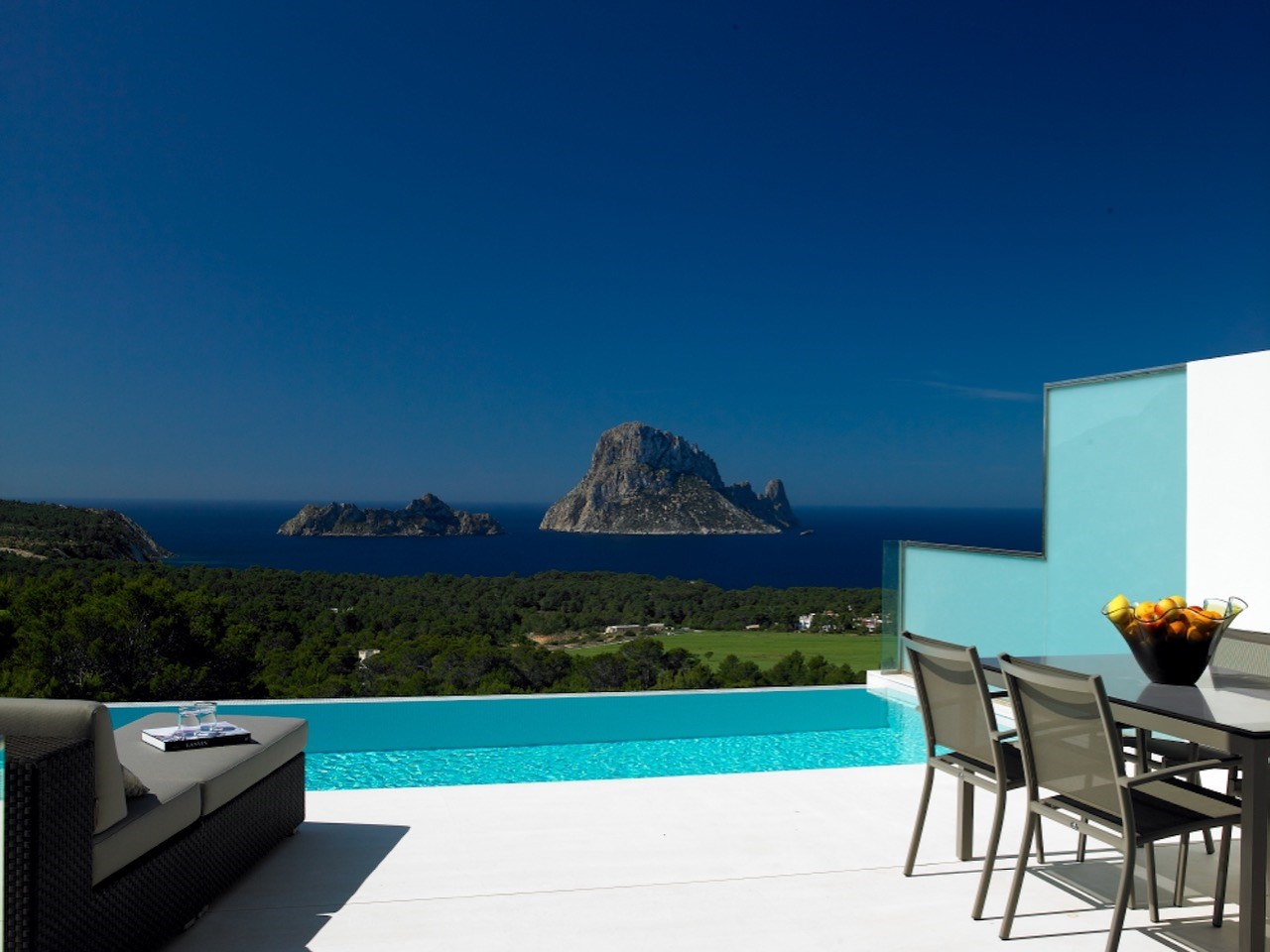 Ya al entrar en la zona de estar con una moderna cocina abierta impresiona la magnifica vista al isla de Es Vedrá perfeccionada por la subsiguiente terraza con piscina desbordante.