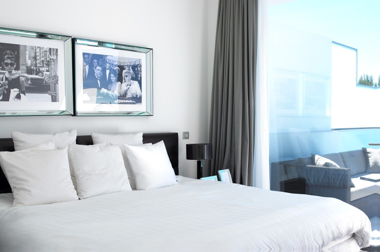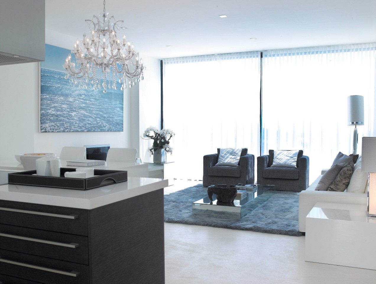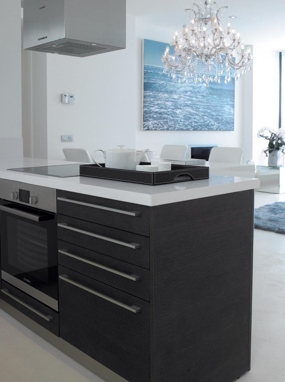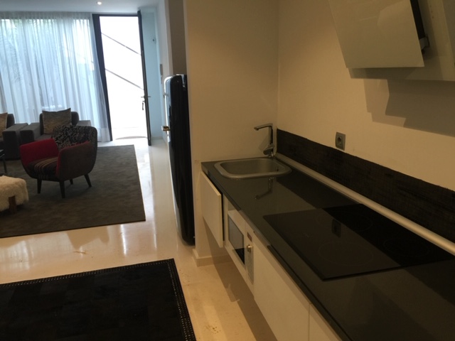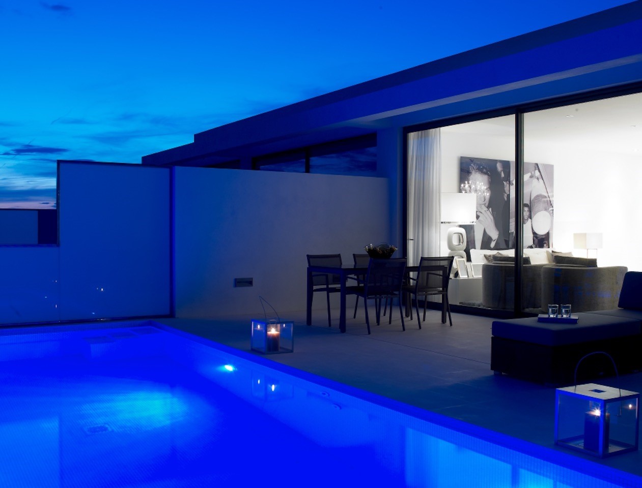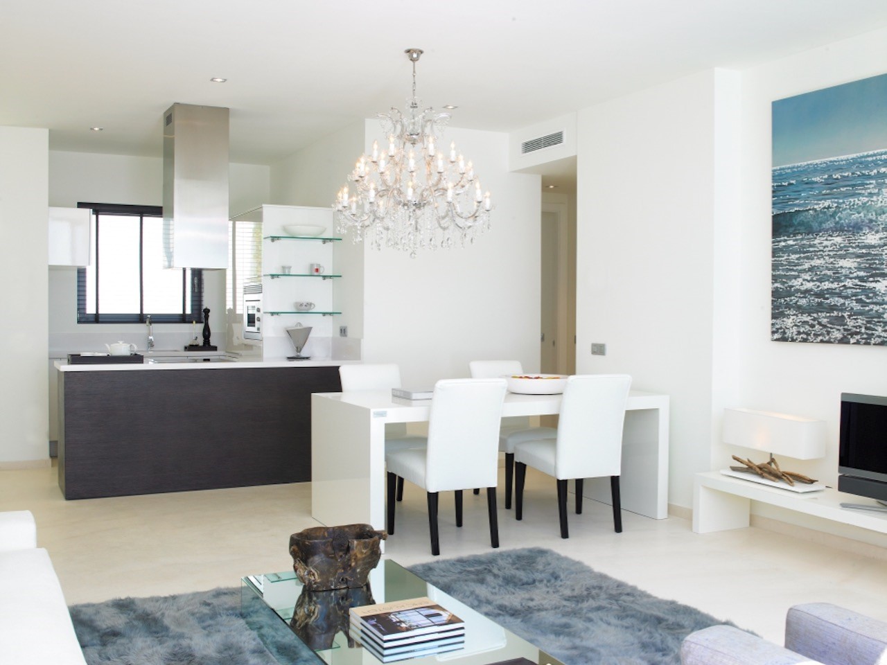 Ya al entrar en la zona de estar con una moderna cocina abierta impresiona la magnifica vista al isla de Es Vedrá perfeccionada por la subsiguiente terraza con piscina desbordante.