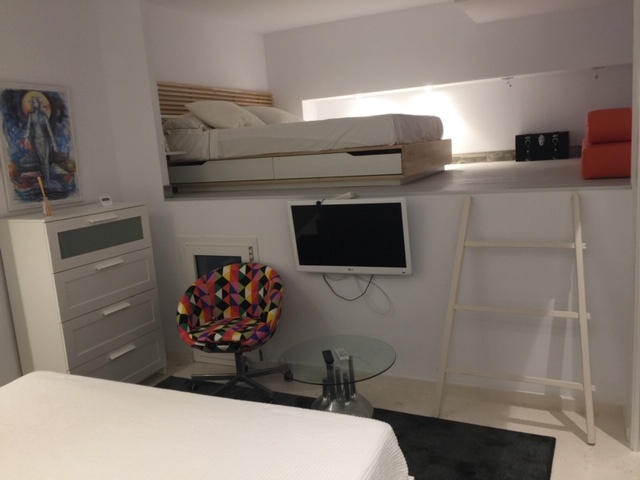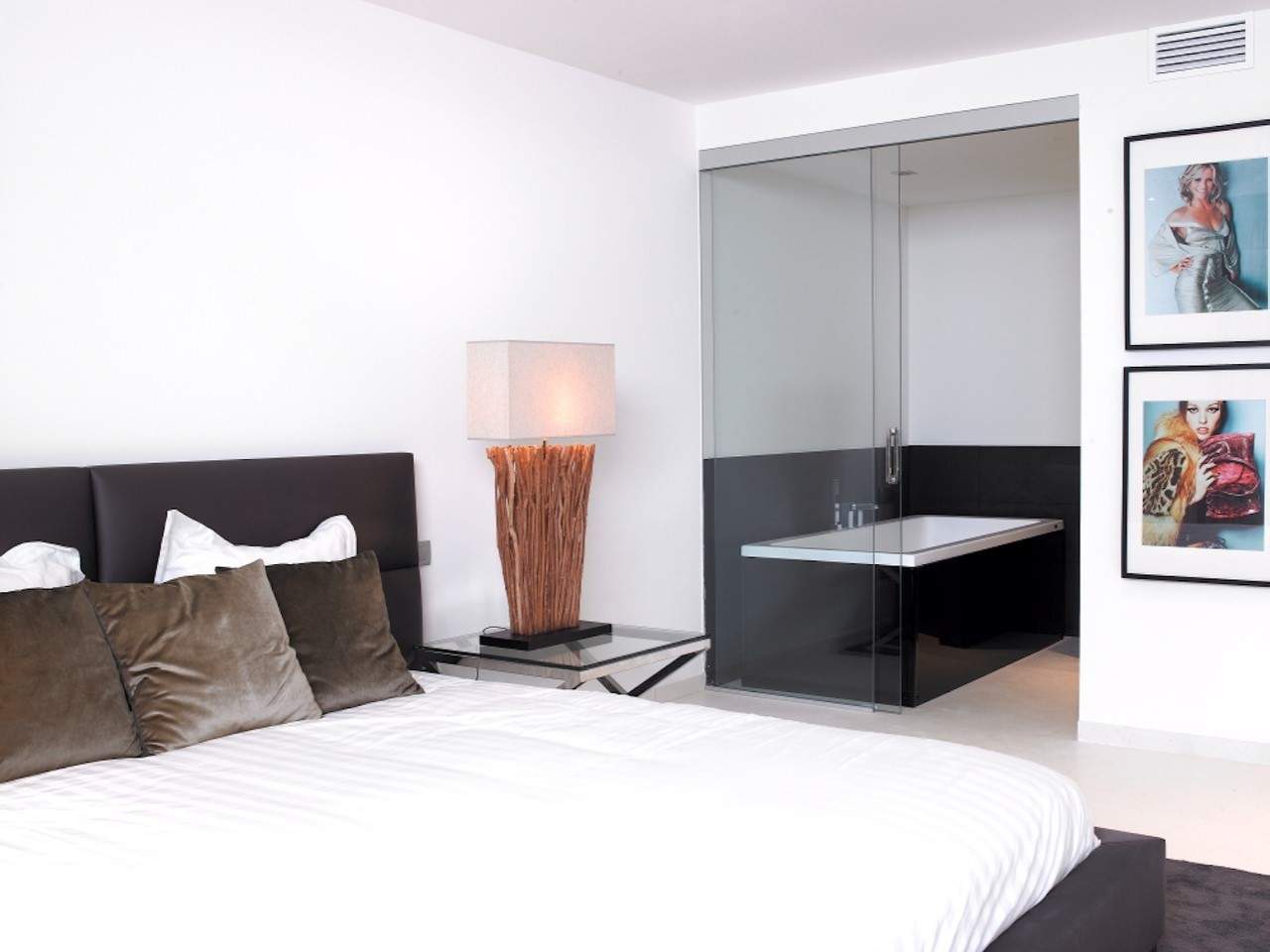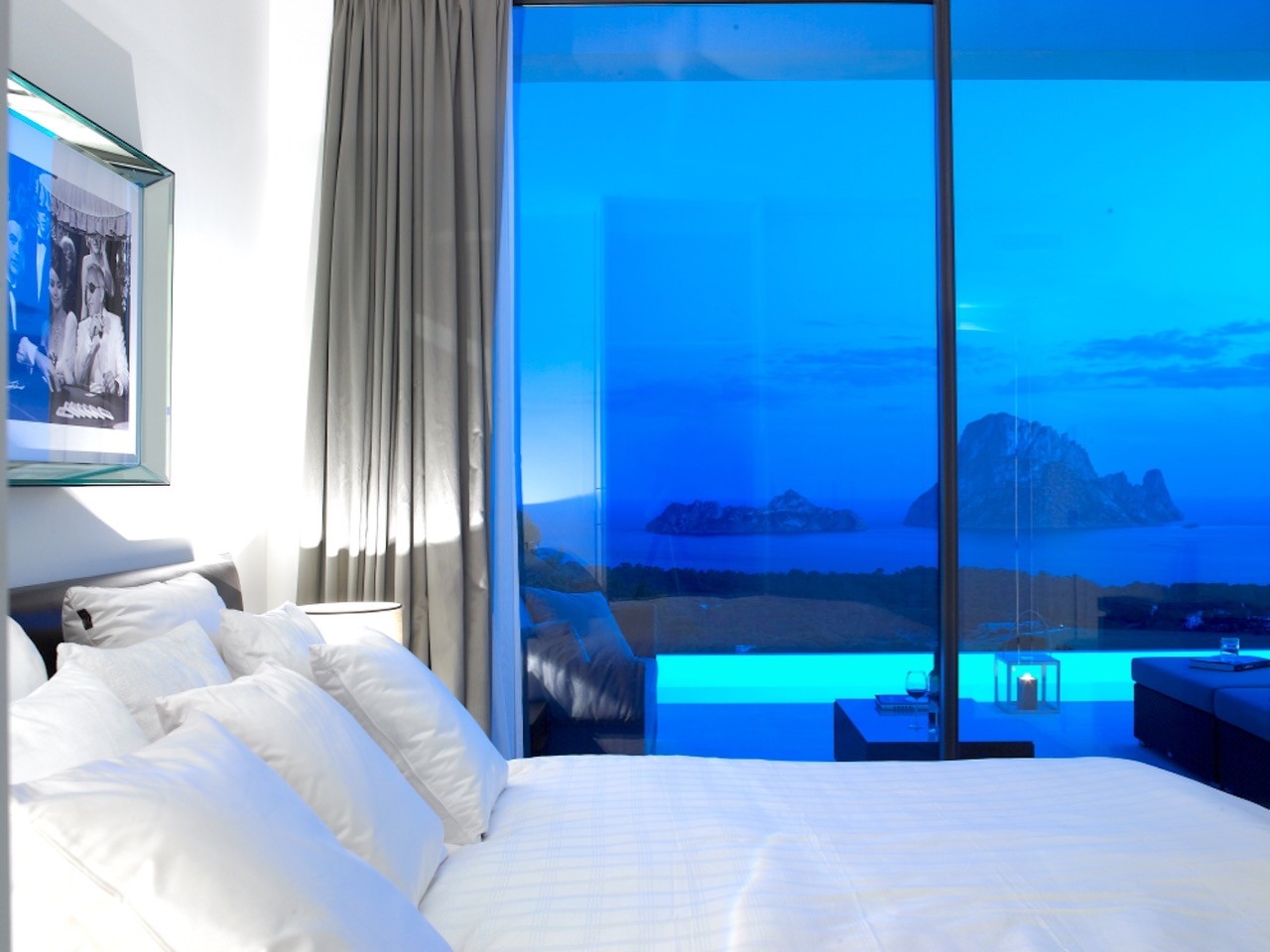 El nivel superior ofrece a parte de la sala, 2 baños y 2 dormitorios; uno de ellos también con la vista brillante a Es Vedrà y acceso directo a la terraza con piscina.