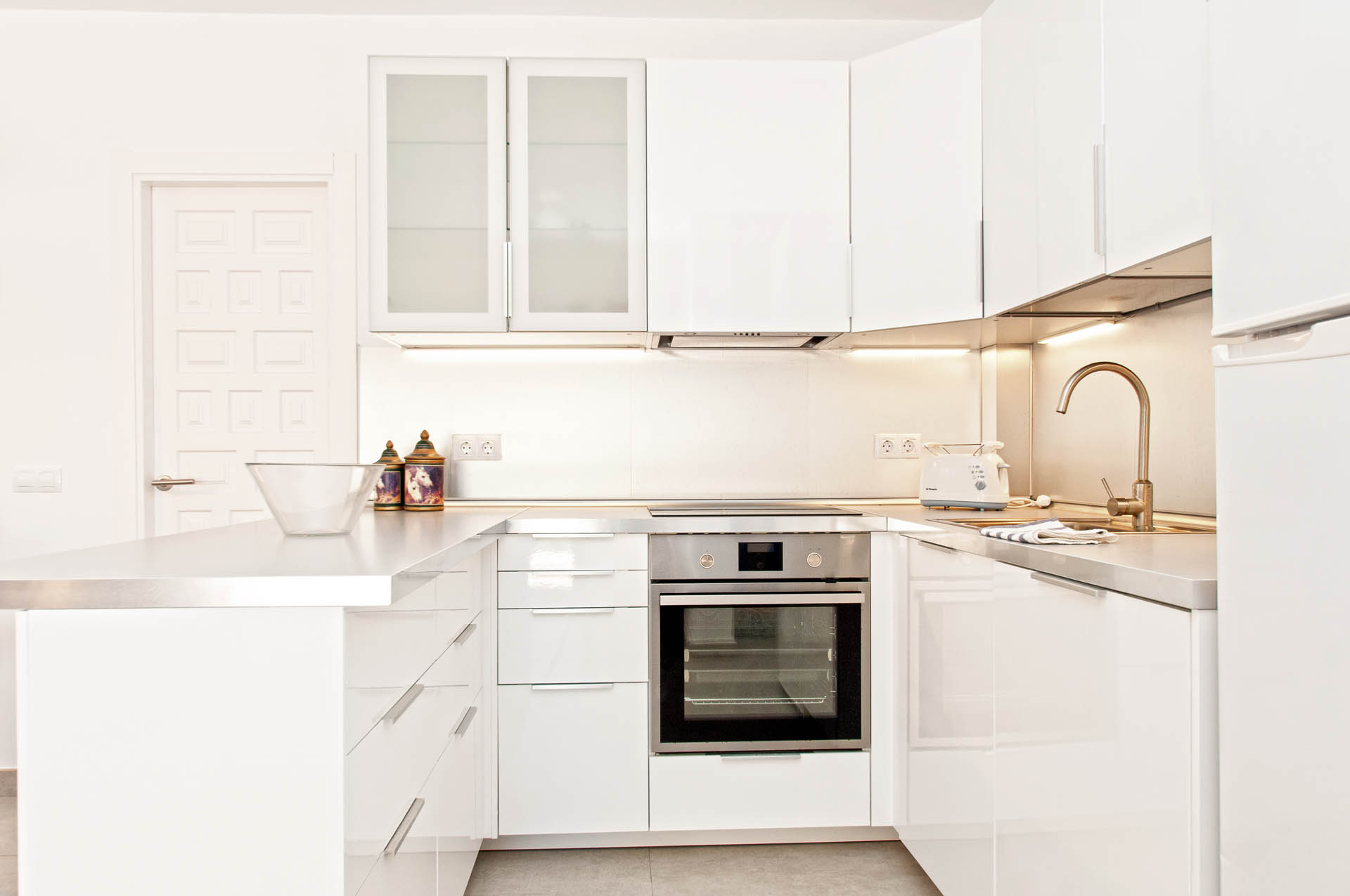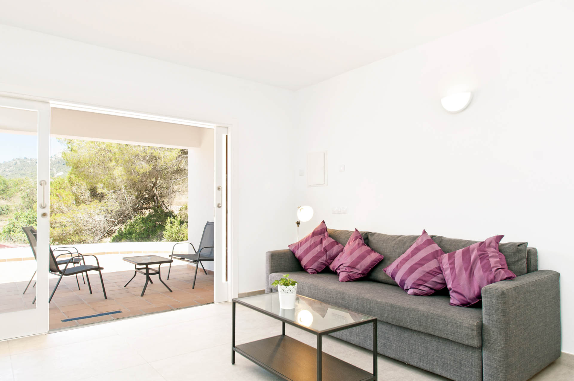 Salón comedor con cocina abierta y salida a la terraza con un bonito porche frente a la piscina.