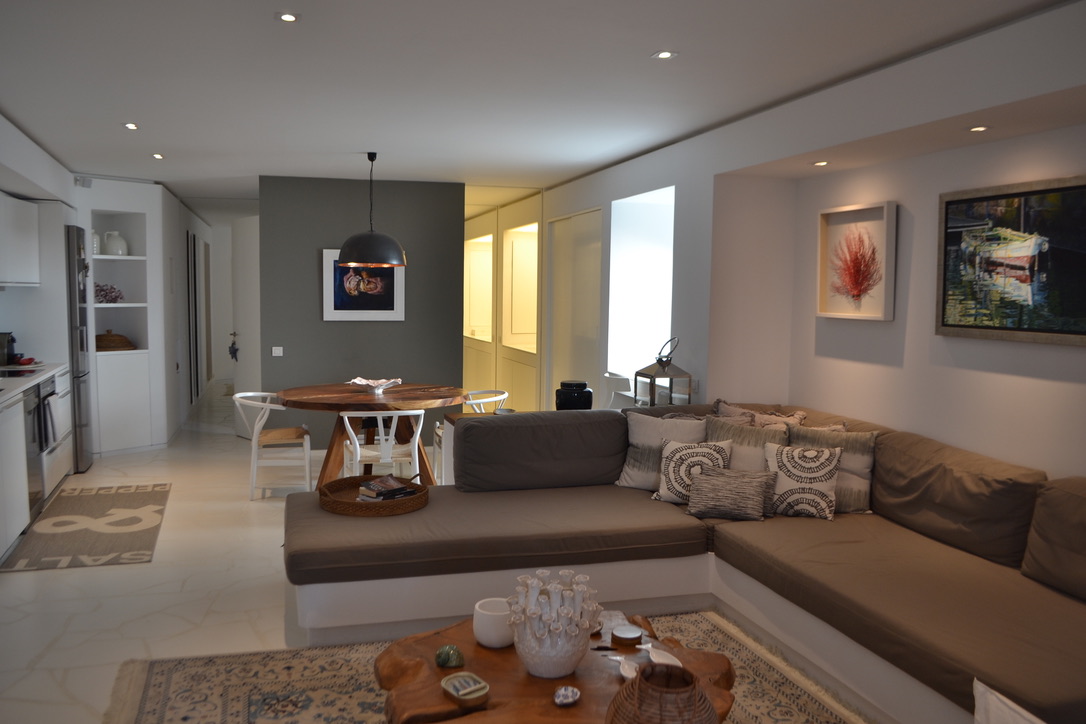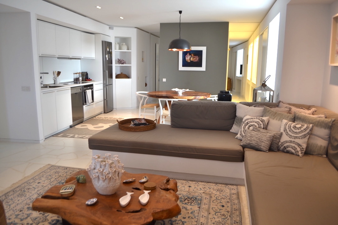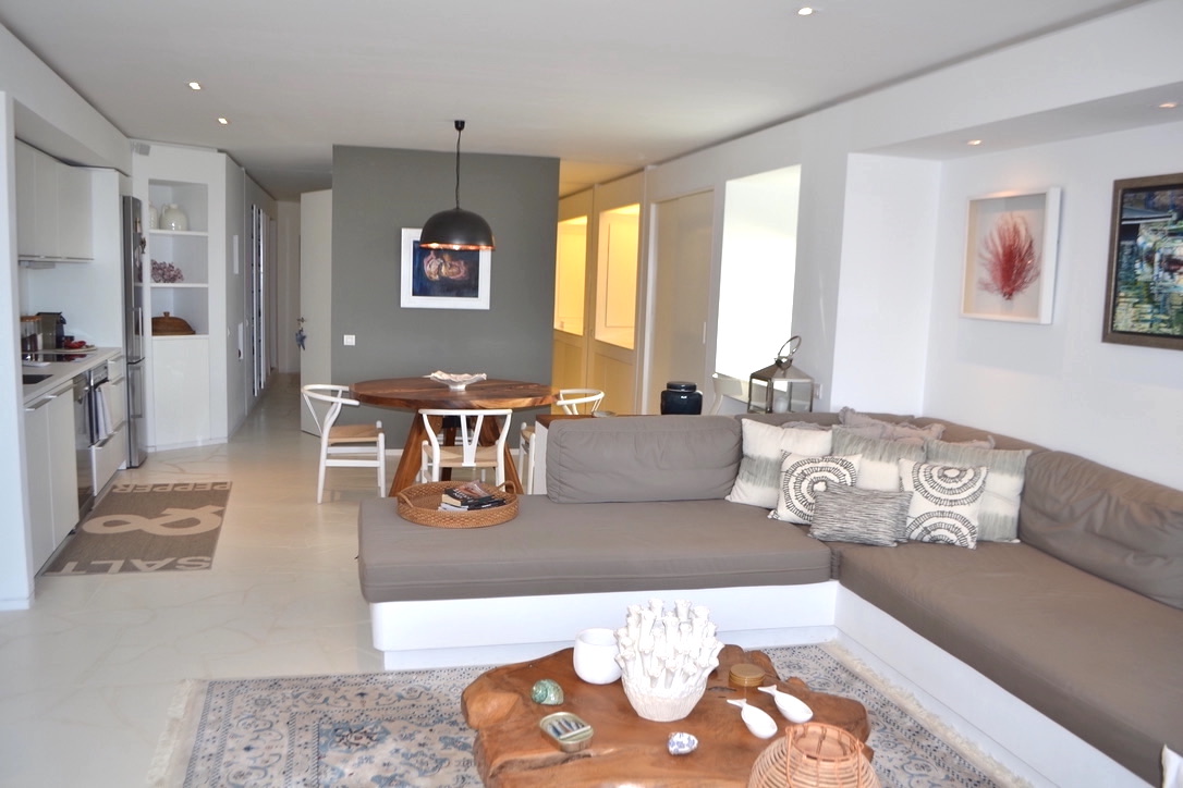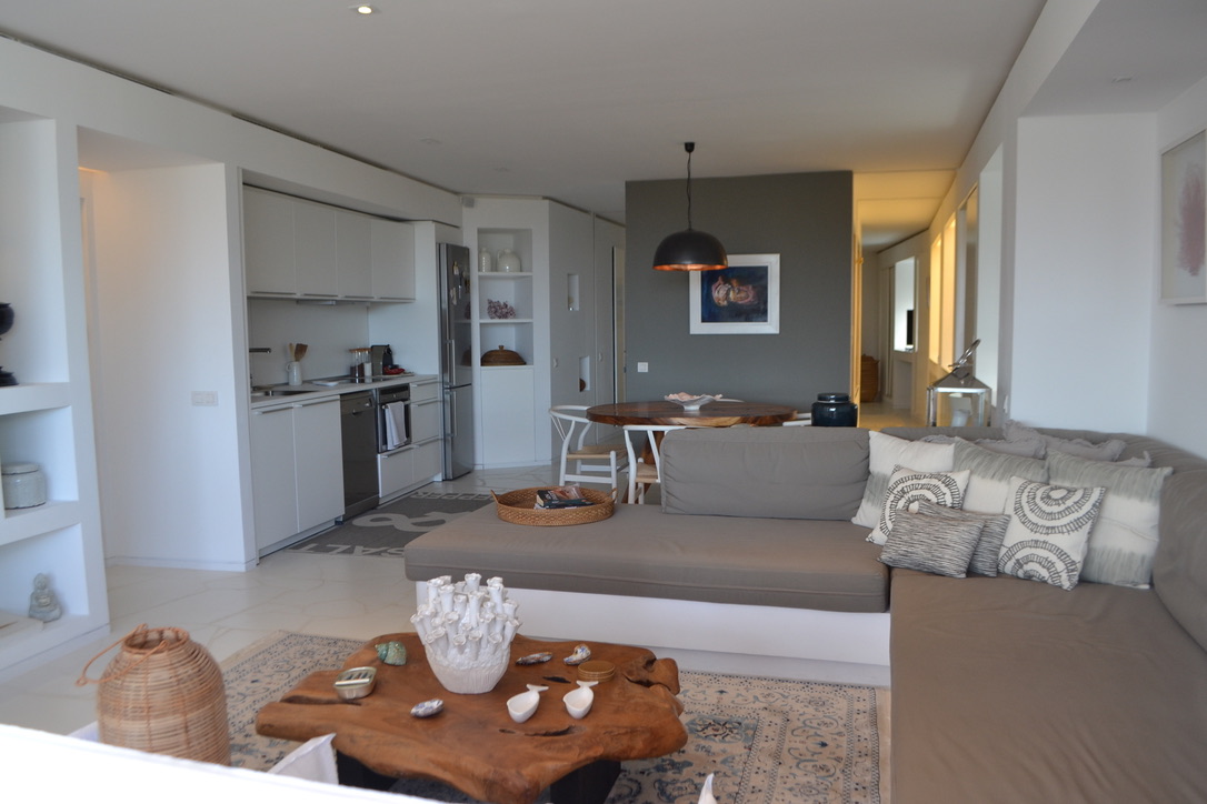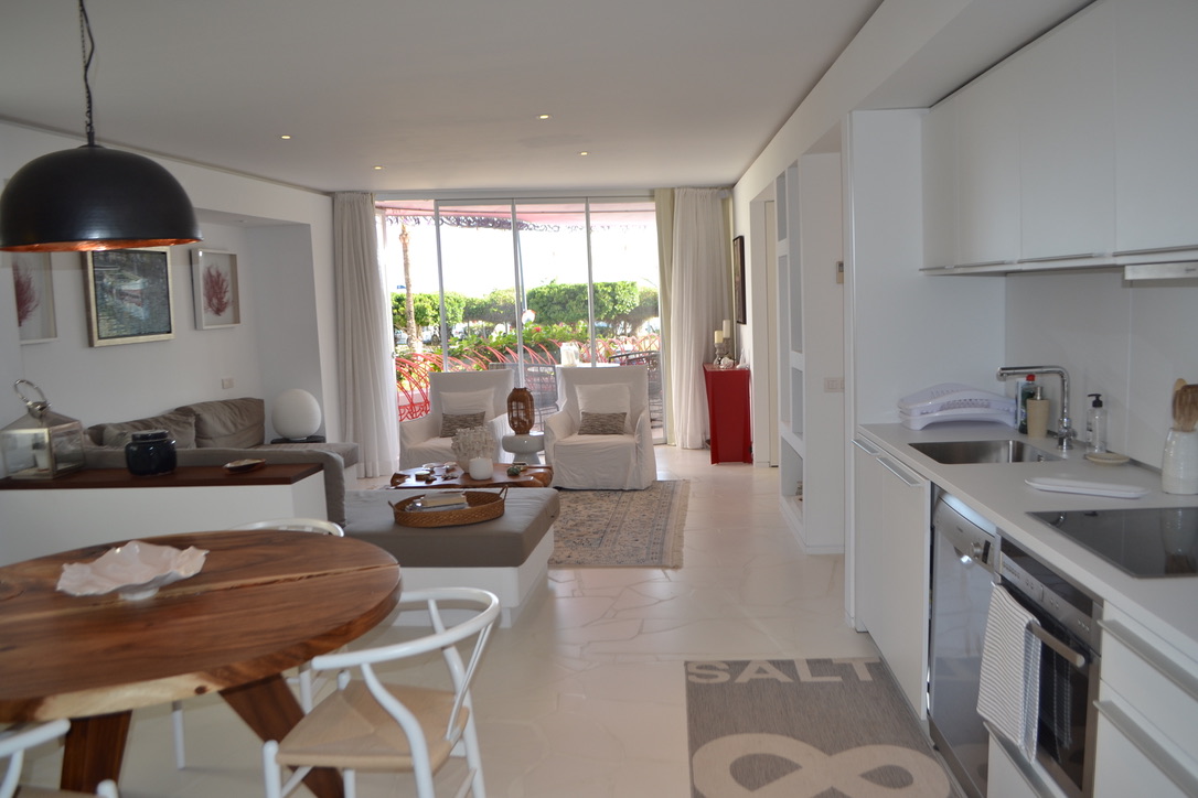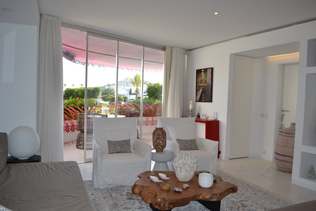 El apartamento ha sido diseñando en su interior por ksar Living con mobiliario de acogedor y de calidad con marcas reconocidas. La vivienda tiene un gran salón comedor con salida a la amplia terraza. En el salón esta la cocina en un lateral totalmente equipada. Hay dos baños completos y un amplio dormitorio. La vivienda tiene aire acondicionado por conductos. Esta urbanización es una de las mejores en Ibiza ya que dispone de piscina comunitaria así como gimnasio y sauna. Seguridad las 24 horas del día con petición de documentación para su accesibilidad.