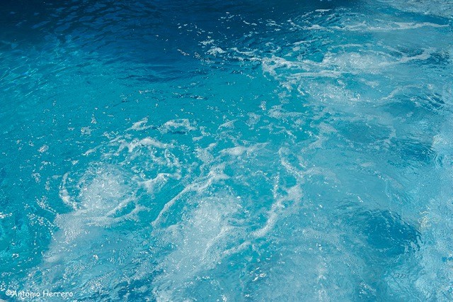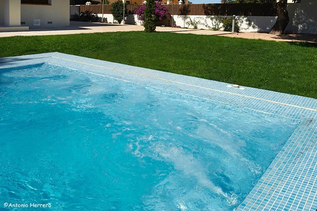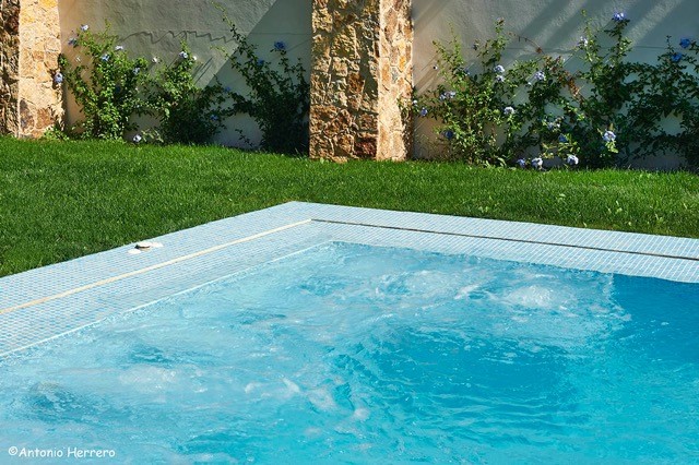 Piscina desbordante con jacuzzi, rodeada de césped y una magnífica zona de relax para tomar el sol.