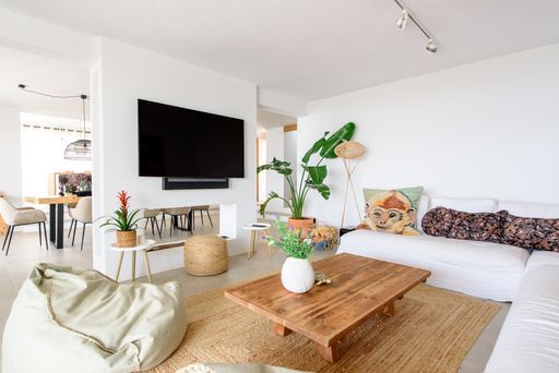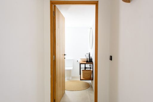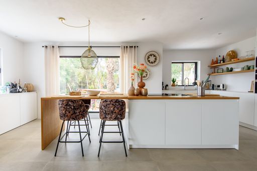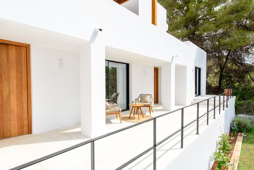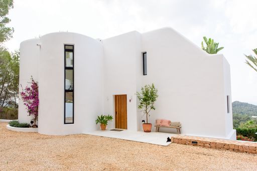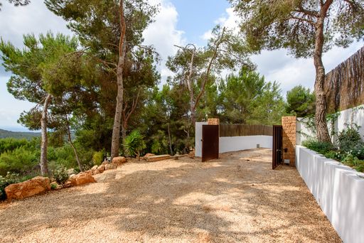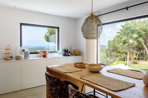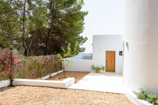En el nivel de entrada, se entra en un gran salón / comedor con una cocina abierta, con vistas al jardín y la piscina, así como Formentera. También hay un dormitorio más pequeño con baño en-suite y un dormitorio doble, también con baño en-suite.